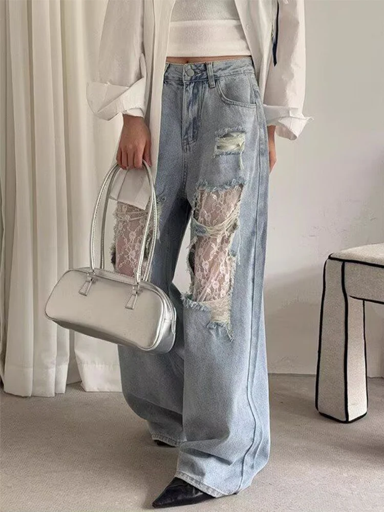 2025 femmes Y2K Style américain taille haute dentelle épissé Denim pantalon ample jambe large pantalon mode Hottie trou Patchwork jean - TopDealBox