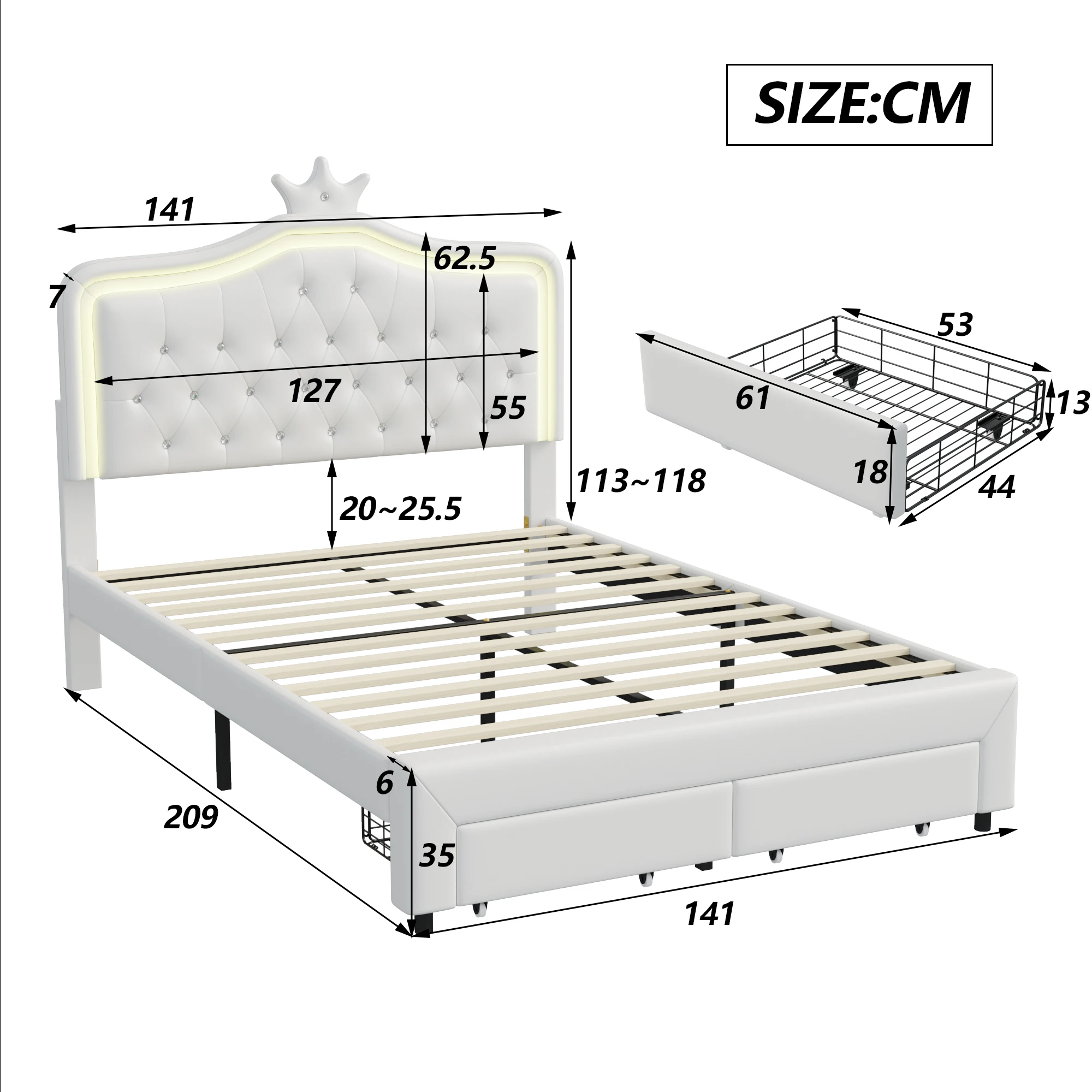 ♡Aperçu rapideLit fille 90x200 cm avec LED et tête de lit en forme de couronne, cadre de lit simple avec base à lattes, tissu PU, blanc158.39 EUREUR 300.71Populaire