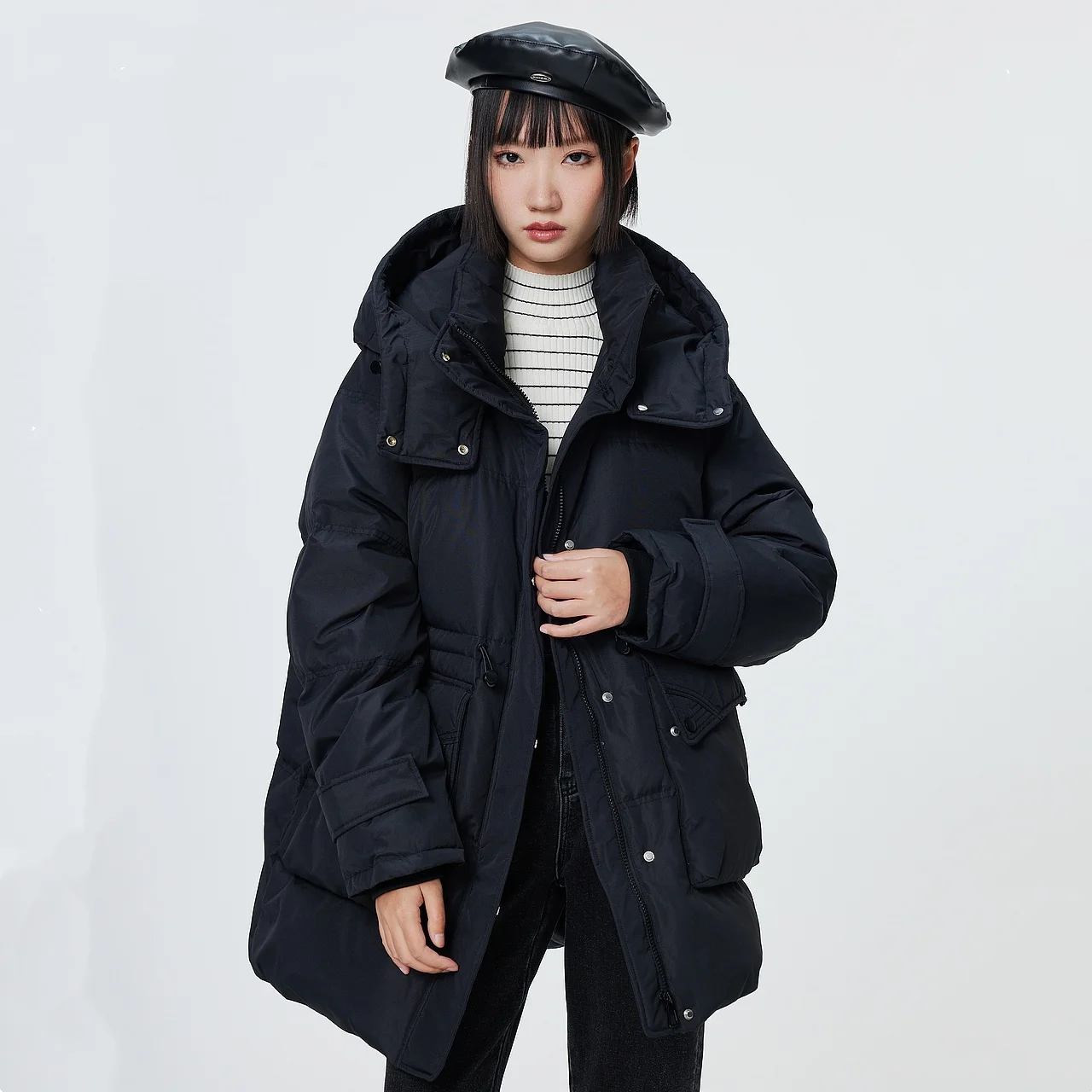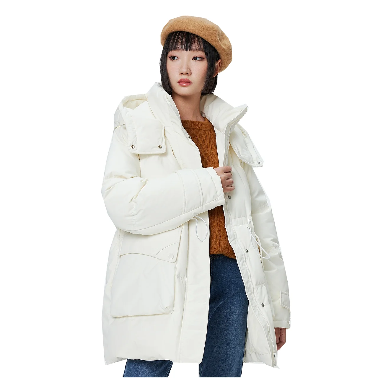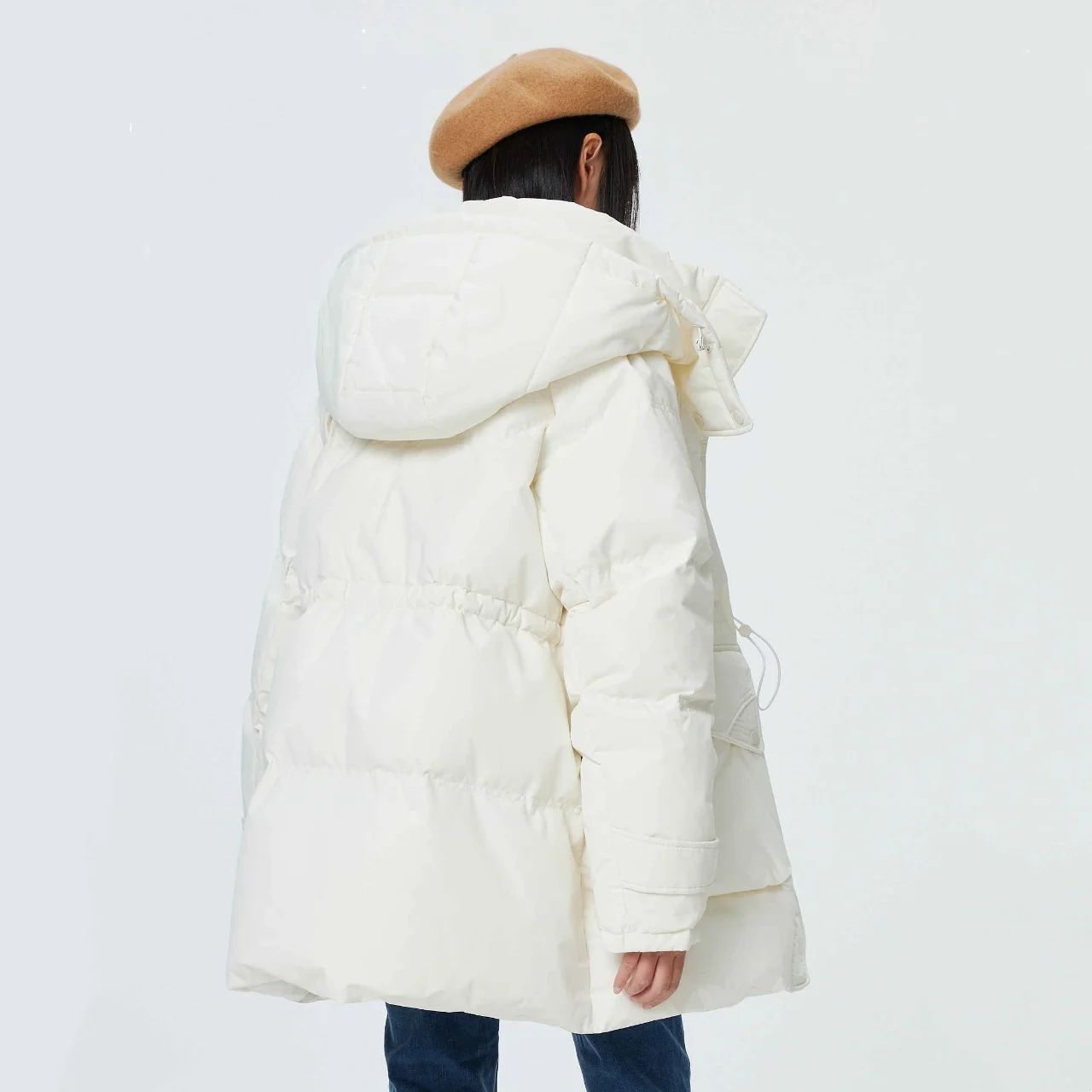 Metersbonwe doudoune longue surdimensionnée à capuche pour femme réglable nez de porc boucle ceinture de taille utilitaire duvet de canard Parka chaud hiver - TopDealBox