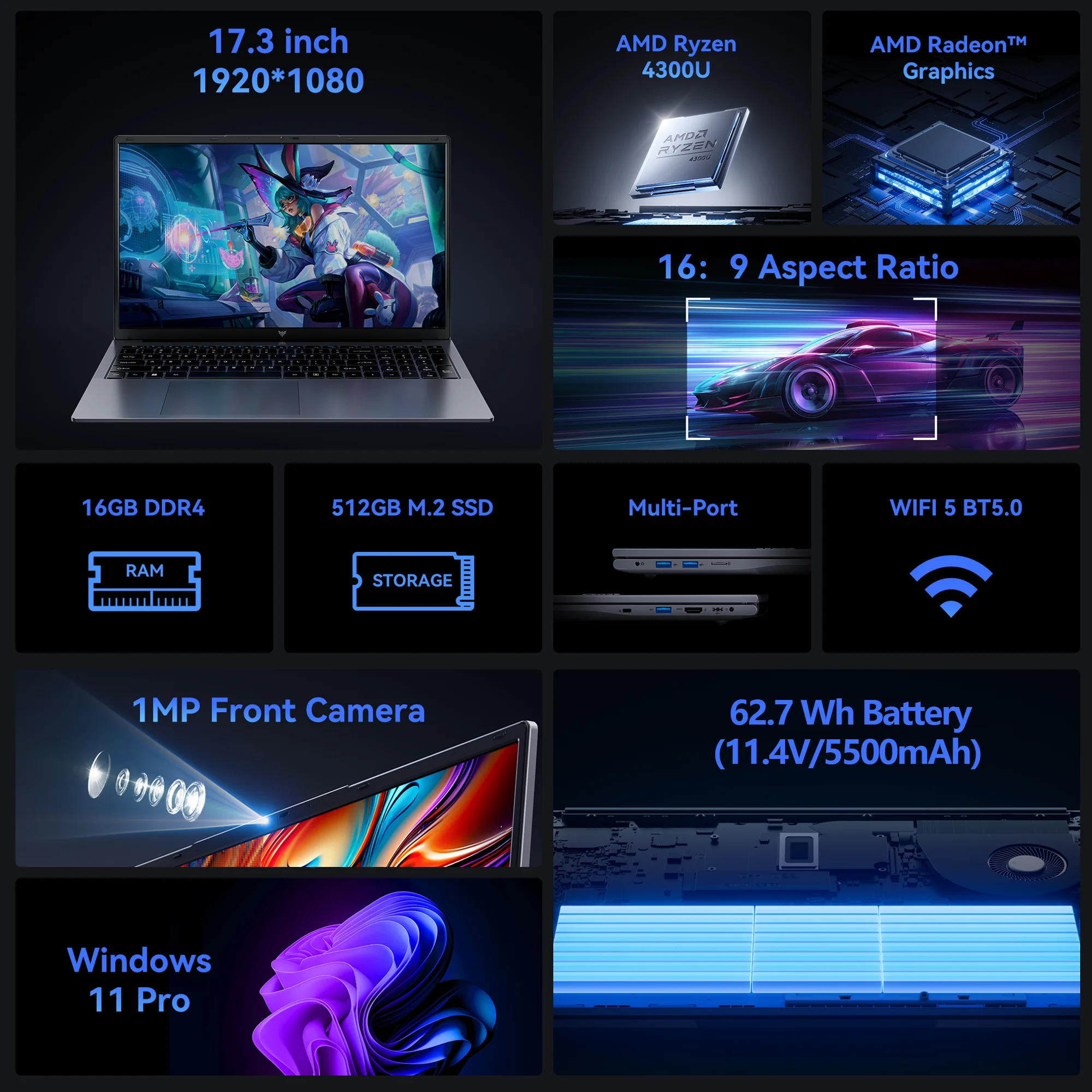Ordinateur portable ACEMAGIC 17,3 pouces, processeur Ryzen 3 4300U, 16 Go de RAM DDR4, SSD M.2 512 Go, WiFi 5, BT5.0, écran 1080 FHD, batterie longue durée 5500 mAh - TopDealBox