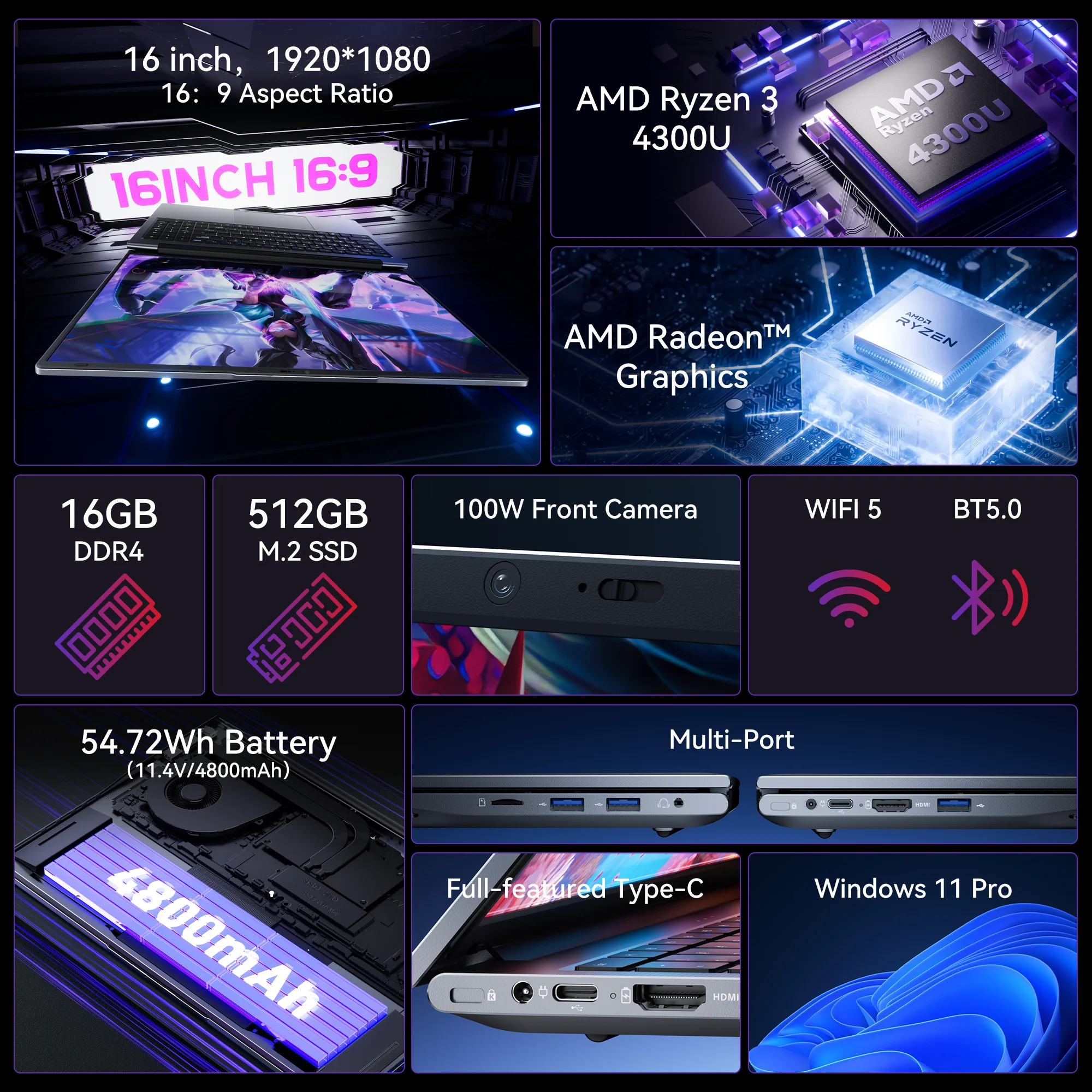 Ordinateurs portables ACEMAGIC avec processeur AMD Ryzen 4300U, 16 Go de DDR4, 512 Go de SSD, ordinateur portable 16,0 pouces, Windows 11, écran FHD 1920P - TopDealBox
