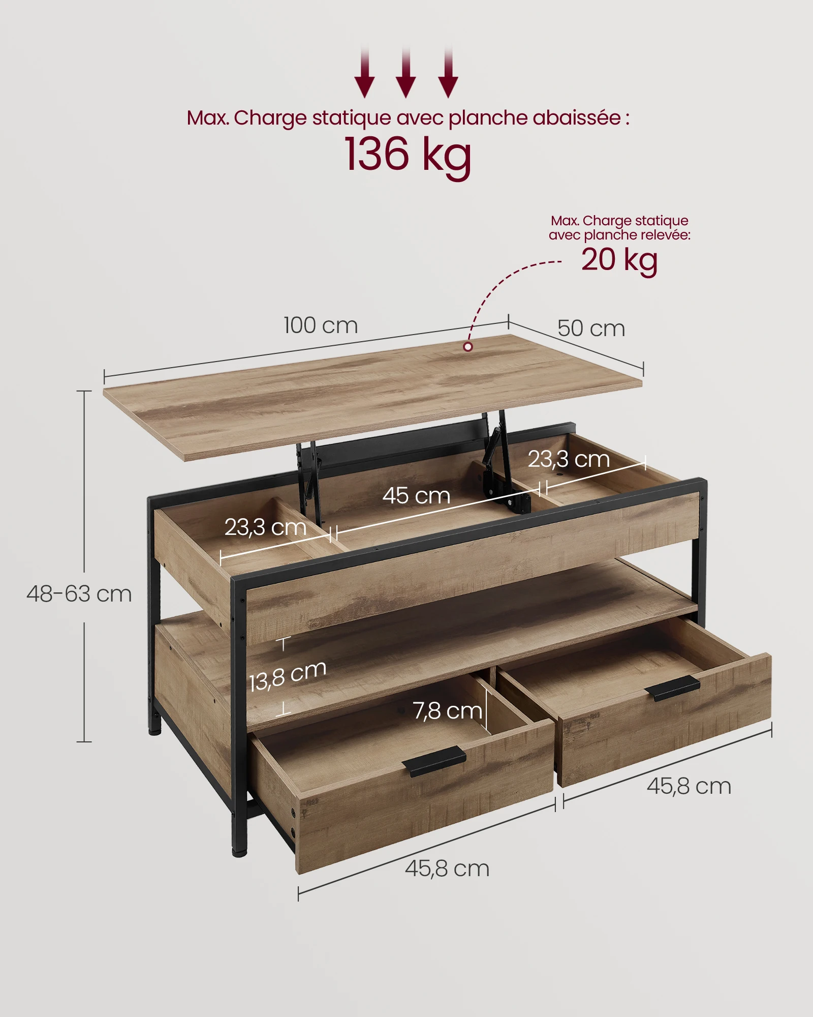 ♡Aperçu rapideVASAGLE Table Basse, Table de Salon avec Plateau Relevable, avec Rangement Ouvert et Compartiment Caché, Barres en Forme de X, 60 x 100 x (48-62) cm58.39 EUREUR 66.02Populaire★★★★★★4.8
